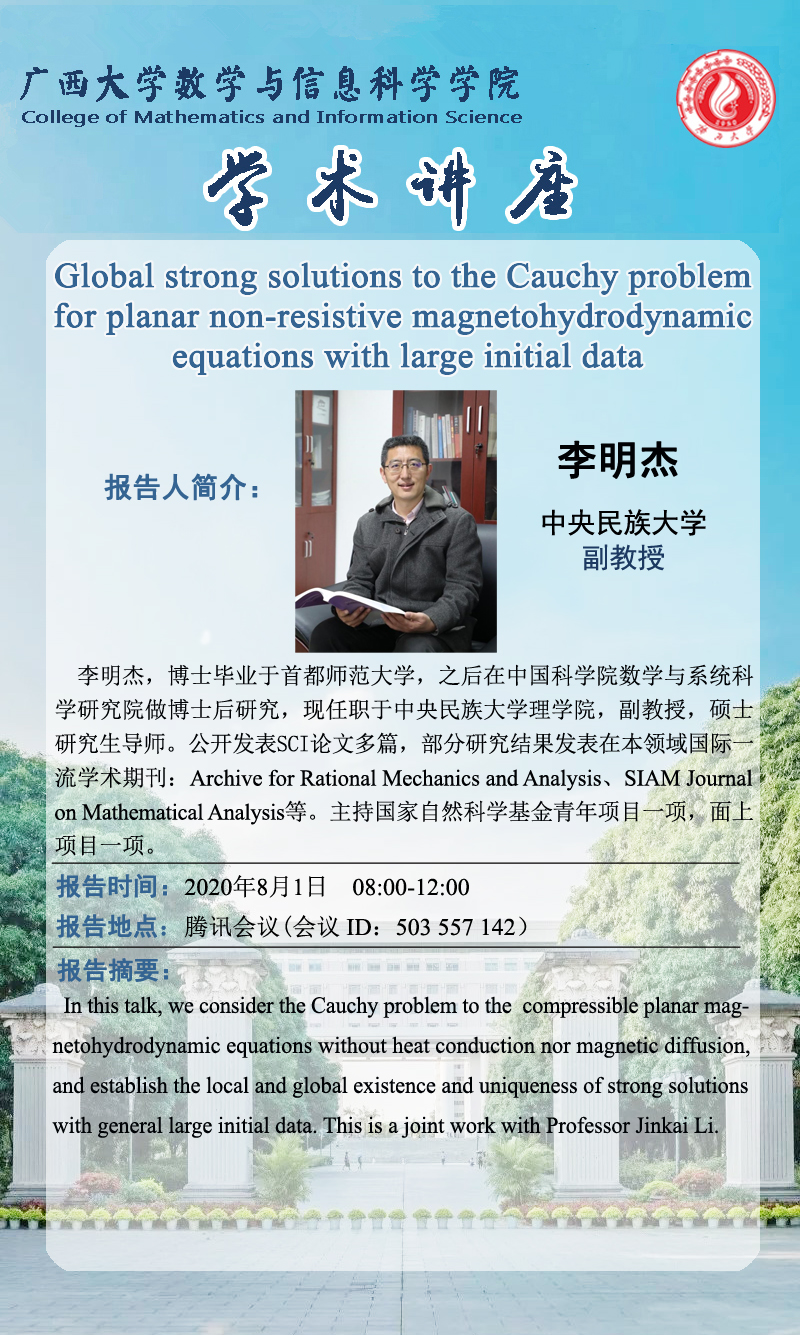 数信学院学术报告:Global strong solutions to the Cauchy problem for planar non-resistive magnetohydrodynamic equations with large initial data
