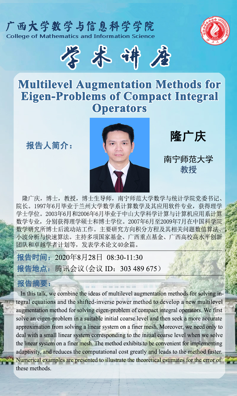 数信学院学术报告:Multilevel Augmentation Methods for Eigen-Problems of Compact Integral Operators
