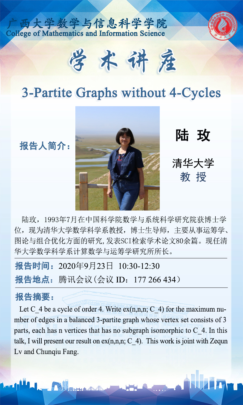 数学与信息科学学院学术讲座:3-Partite Graphs without 4-Cycles