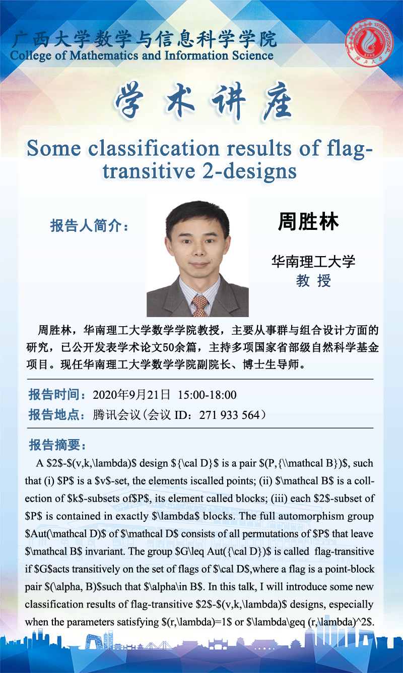 数学与信息科学学院学术讲座:Some classification results of flag-transitive 2-designs