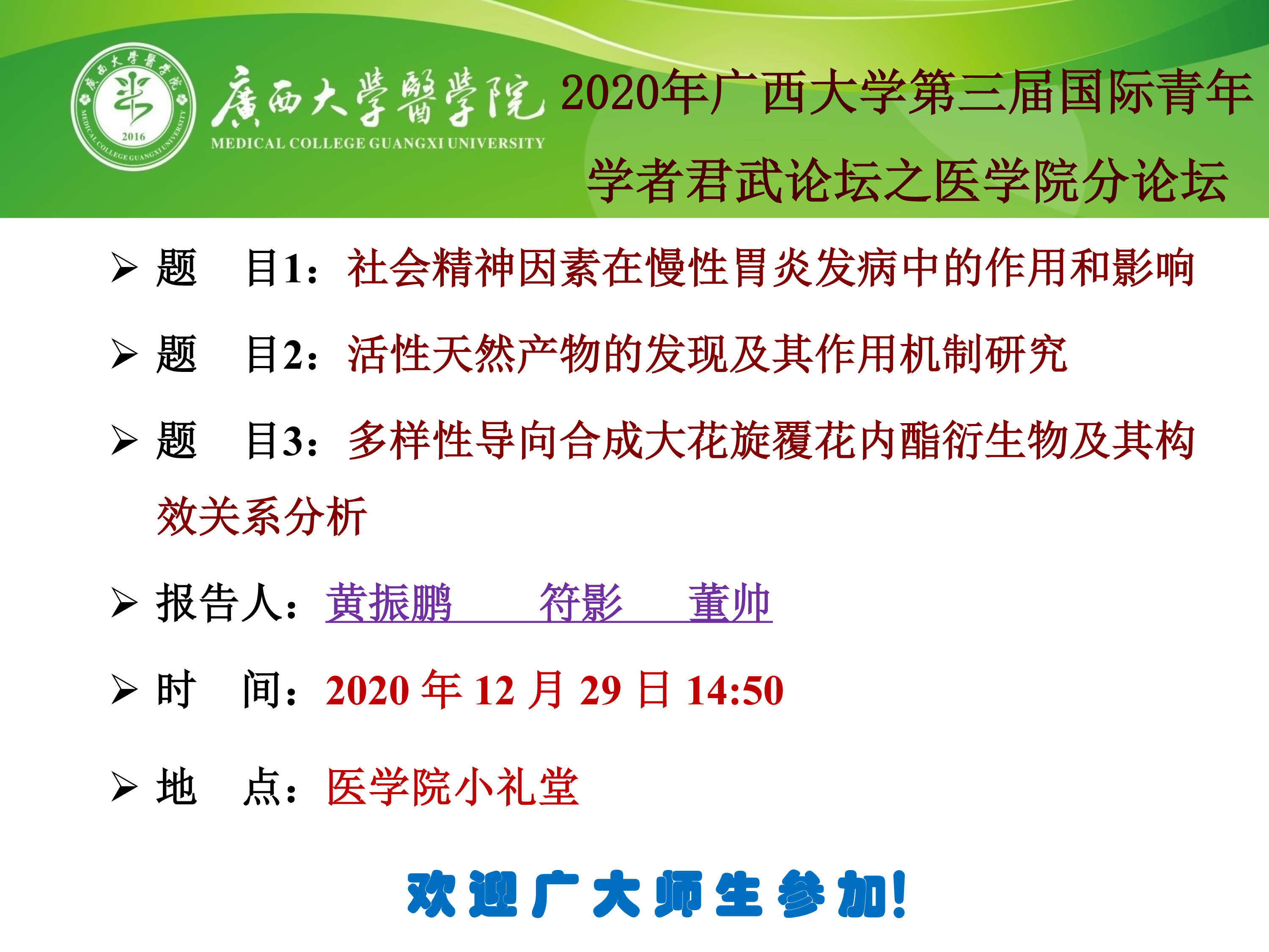 2020年米乐电竞(中国)股份有限公司官网,第三届国际青年学者君武论坛之医学院分论坛:社会精神因素在慢性胃炎发病中的作用和影响;活性天然产物的发现及其作用机制研究;多样性导向合成大花旋覆花内酯衍生物及其构效关系分析;
