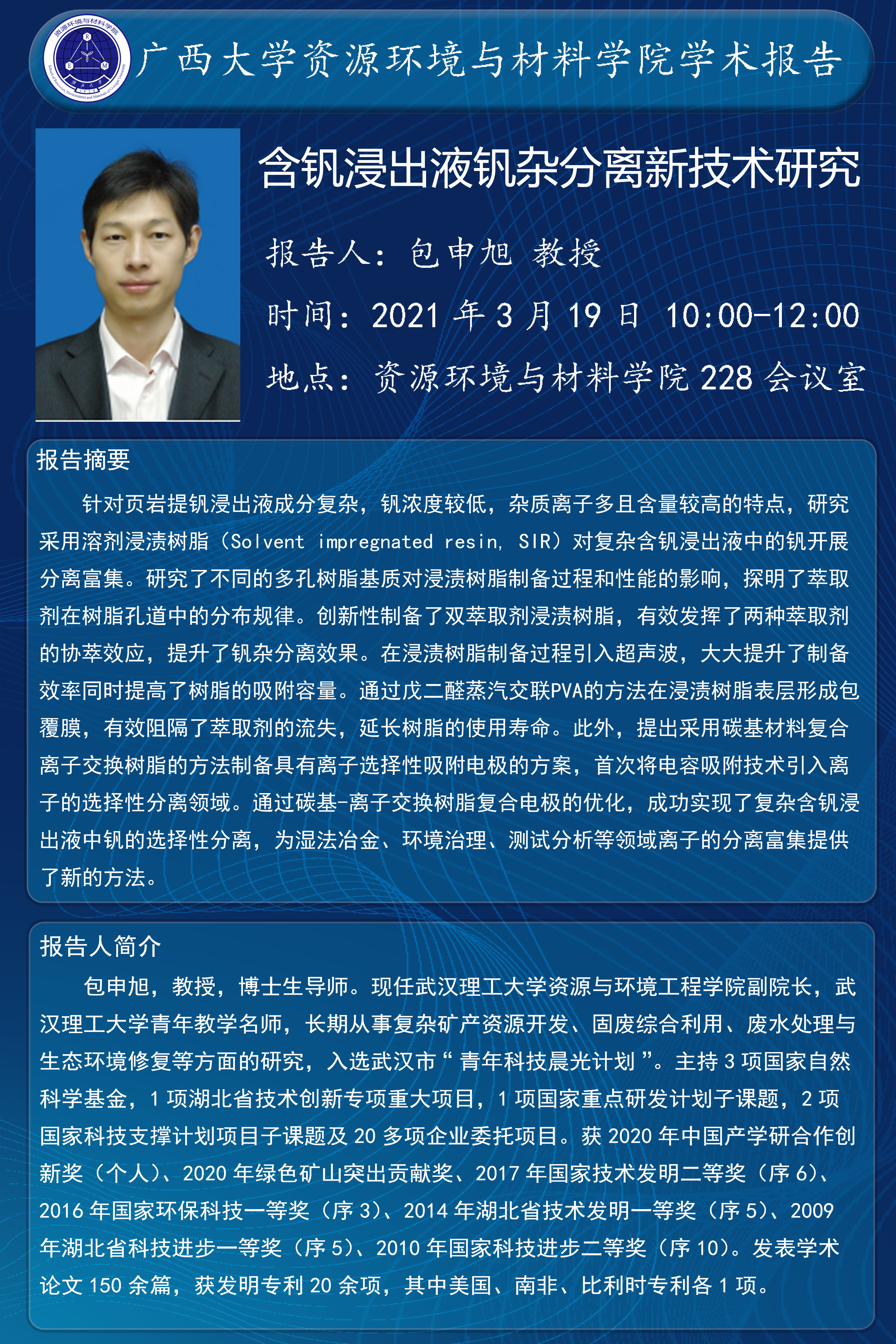 资源环境与材料学院学术报告:含钒浸出液钒杂分离新技术研究