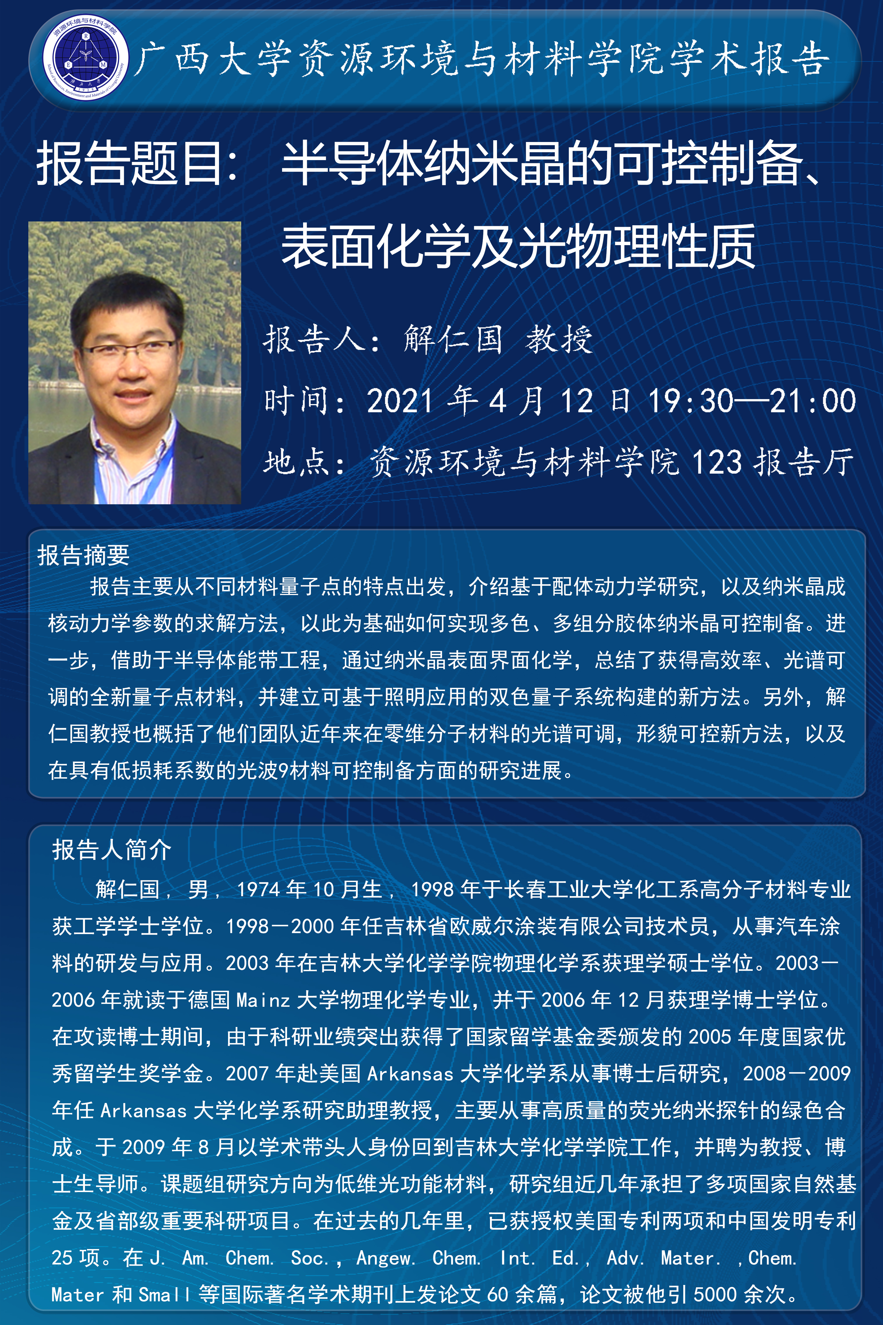 资源环境与材料学院学术报告:半导体纳米晶的可控设备、表面化学及光物理性质