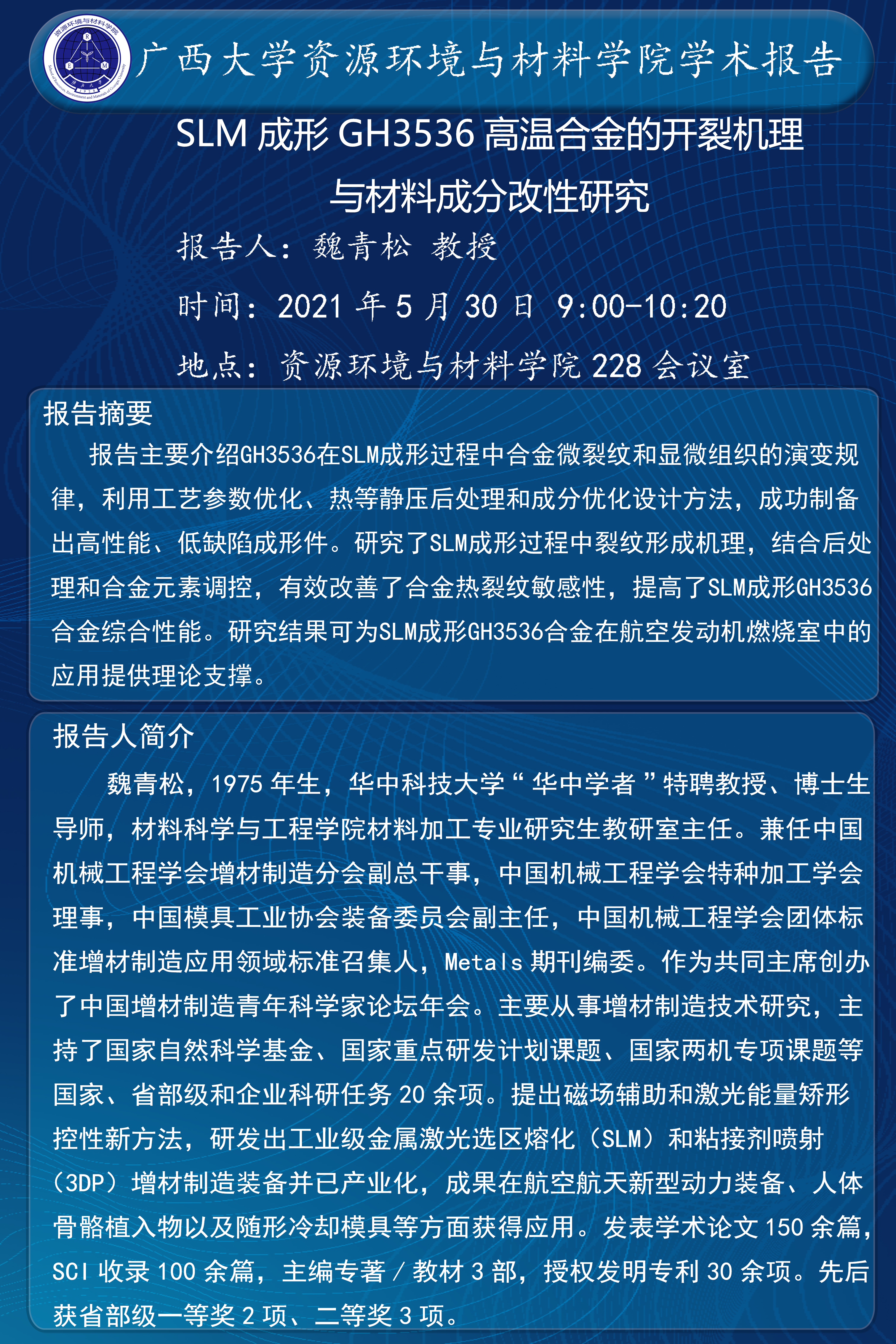 资源环境与材料学院学术报告:SLM成形GH3536高温合金的开裂机理与材料成分改性研究