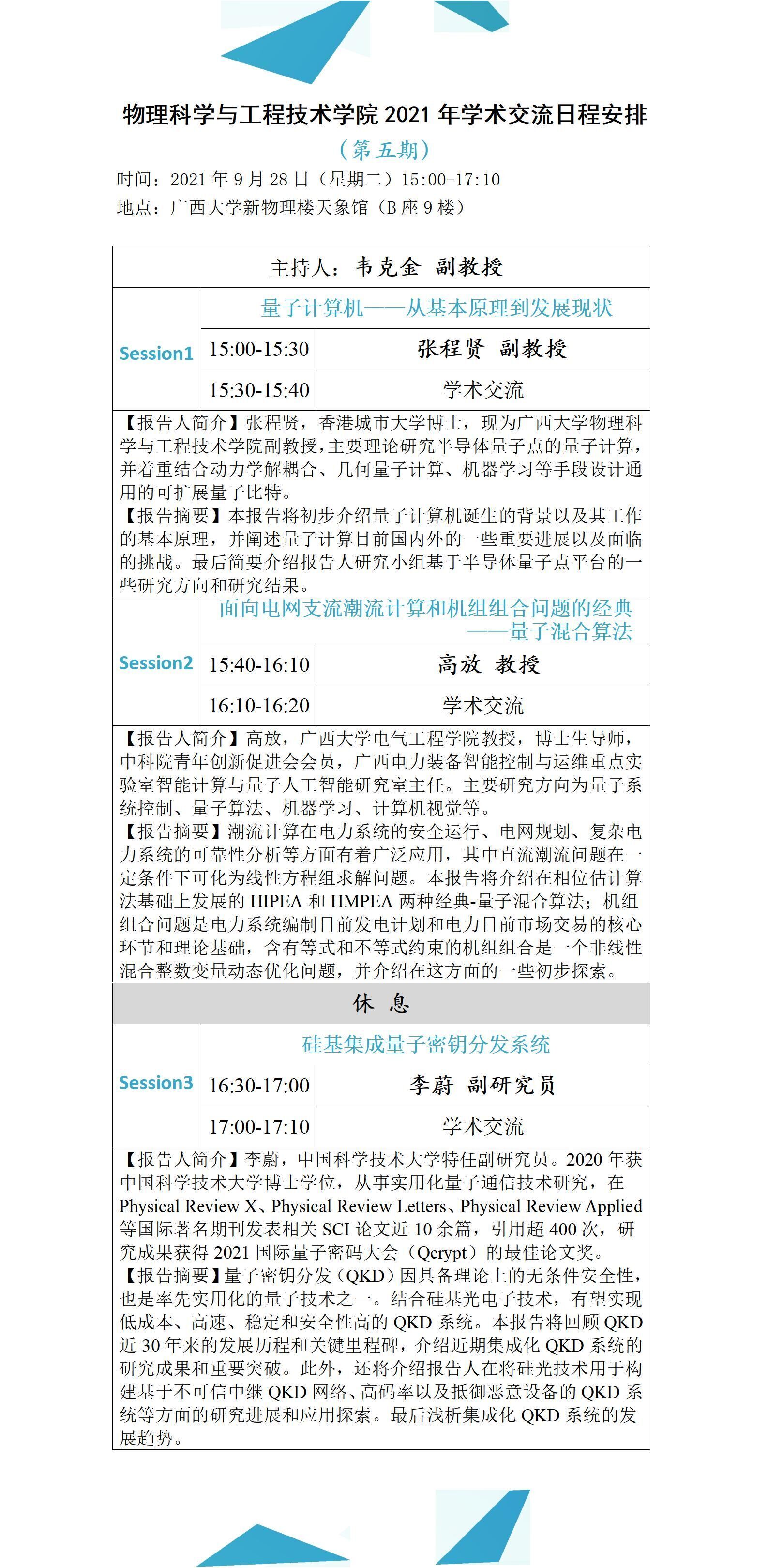 物理科学与工程技术学院学术报告:量子计算机—从基本原理到发展现状;面向电网支流潮流计算和机组组合问题的经典—量子混合算法;硅基集成量子密钥分发系统;