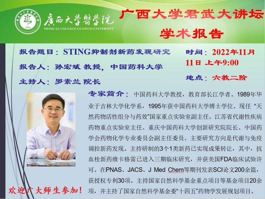 君武大讲坛医学院学术报告 STING抑制剂新药发现研究