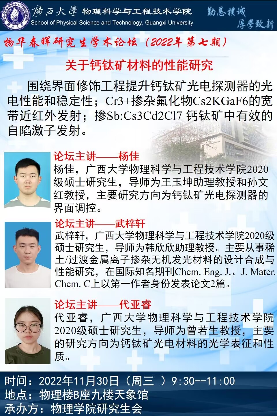 物理学院物华春晖学术论坛(第七期):关于钙钛矿材料的性能研究
