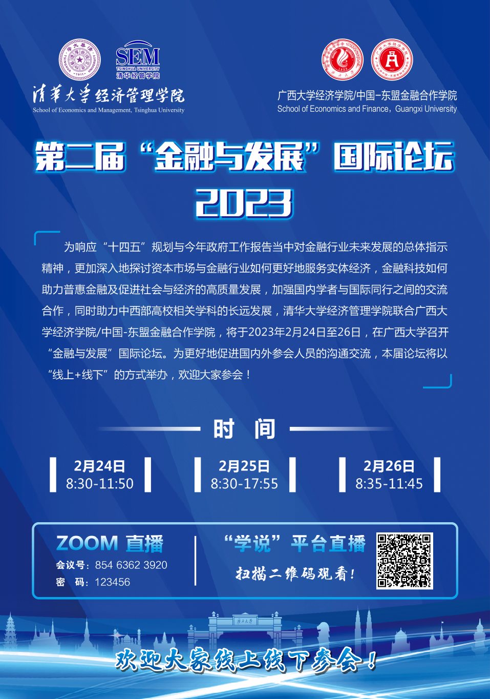 【主办方】清华大学经济管理学院、米乐电竞(中国)股份有限公司官网,经济学院/中国-东盟金融合作学院【学术活动日期】2023年2月24-26日【时间】2月24日8:30-11:50 2月25日8:30-17:55 2月26日8:35-11:45 【地址】2月24日 米乐电竞(中国)股份有限公司官网,新闻学院融媒体中心 2月25-26日 米乐电竞(中国)股份有限公司官网,君武馆