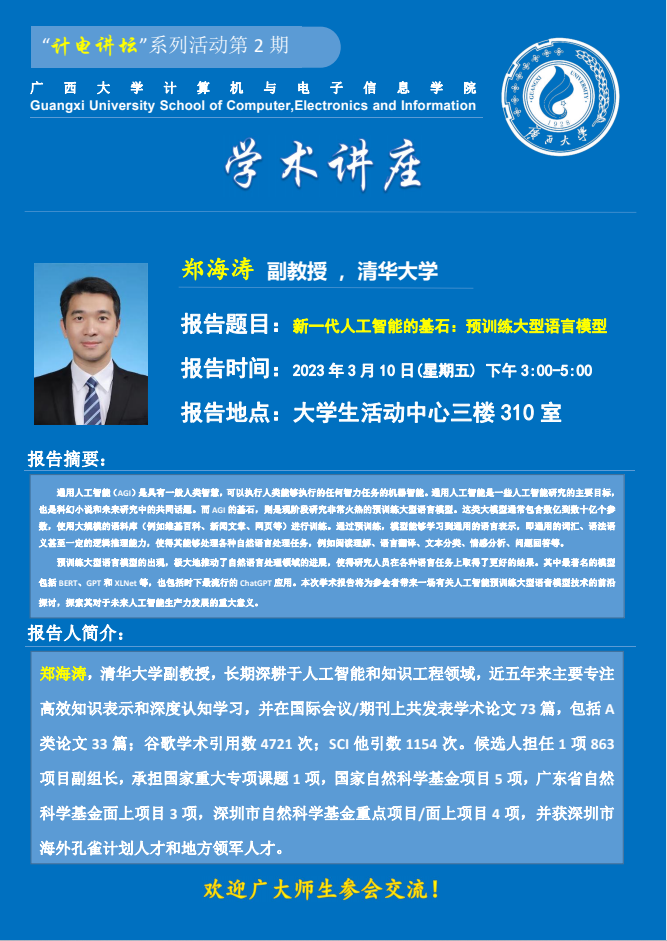 “计电讲坛”系列活动第2期:新一代人工智能的基石:预训练大型语言模型