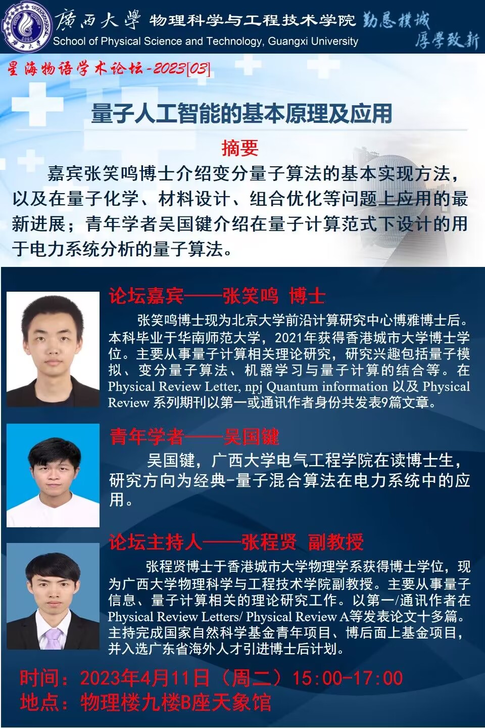 物理学院2023年星海物语学术论坛(第三期):量子人工智能的基本原理及应用