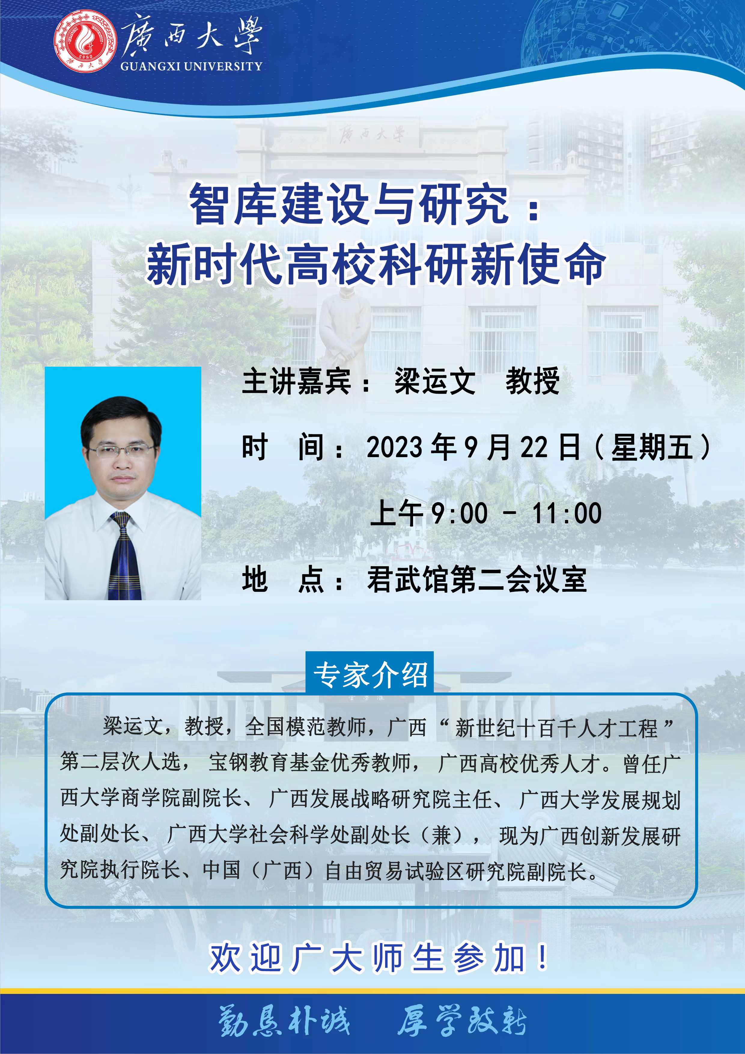 梁运文,教授,全国模范教师,广西“新世纪十百千人才工程”第二层次人选,宝钢教育基金优秀教师,广西高校优秀人才。曾任米乐电竞(中国)股份有限公司官网,商学院副院长、广西发展战略研究院主任、米乐电竞(中国)股份有限公司官网,发展规划处副处长、米乐电竞(中国)股份有限公司官网,社会科学处副处长(兼),现为广西创新发展研究院执行院长、中国(广西)自由贸易试验区研究院副院长。