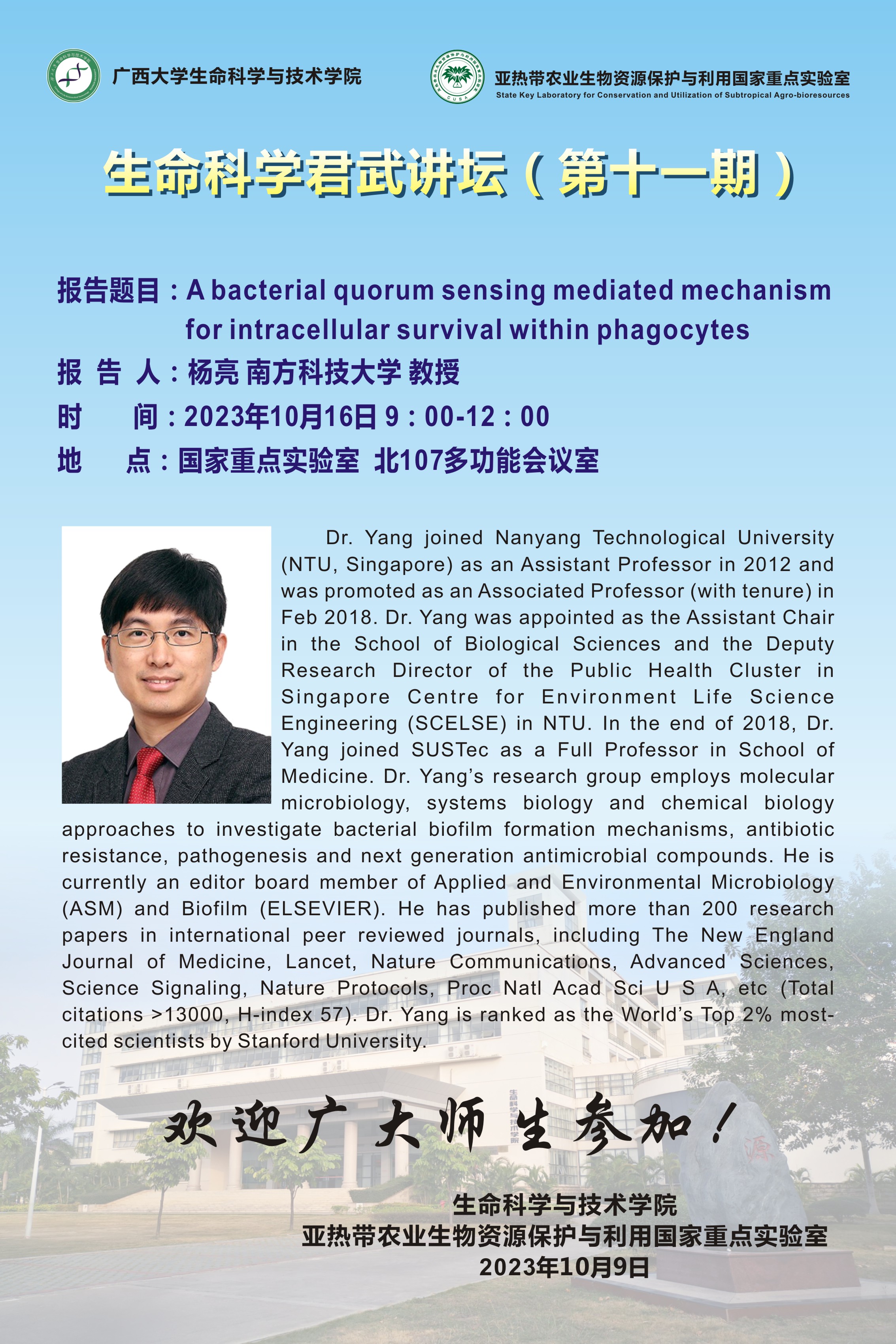 生命科学君武讲坛(第十一期):A bacterial quorum sensing mediated mechanism for intracellular survival within phagocytes