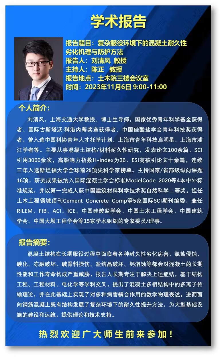 土木建筑工程学院学术报告:复杂服役环境下的混凝土耐久性劣化机理与防护方法