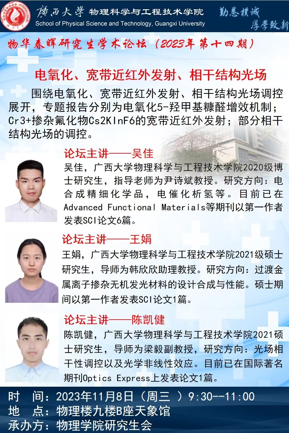 物理学院2023年物华春晖学术论坛(第十四期):电氧化、宽带近红外发射、相干结构光场