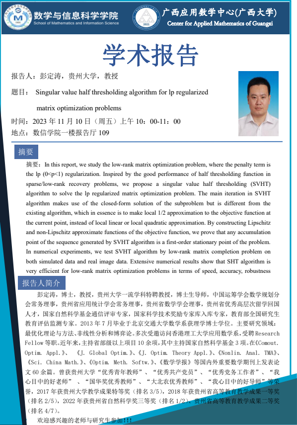 主讲人 彭定涛,贵州大学教授 地址 数信学院一楼报告厅 109