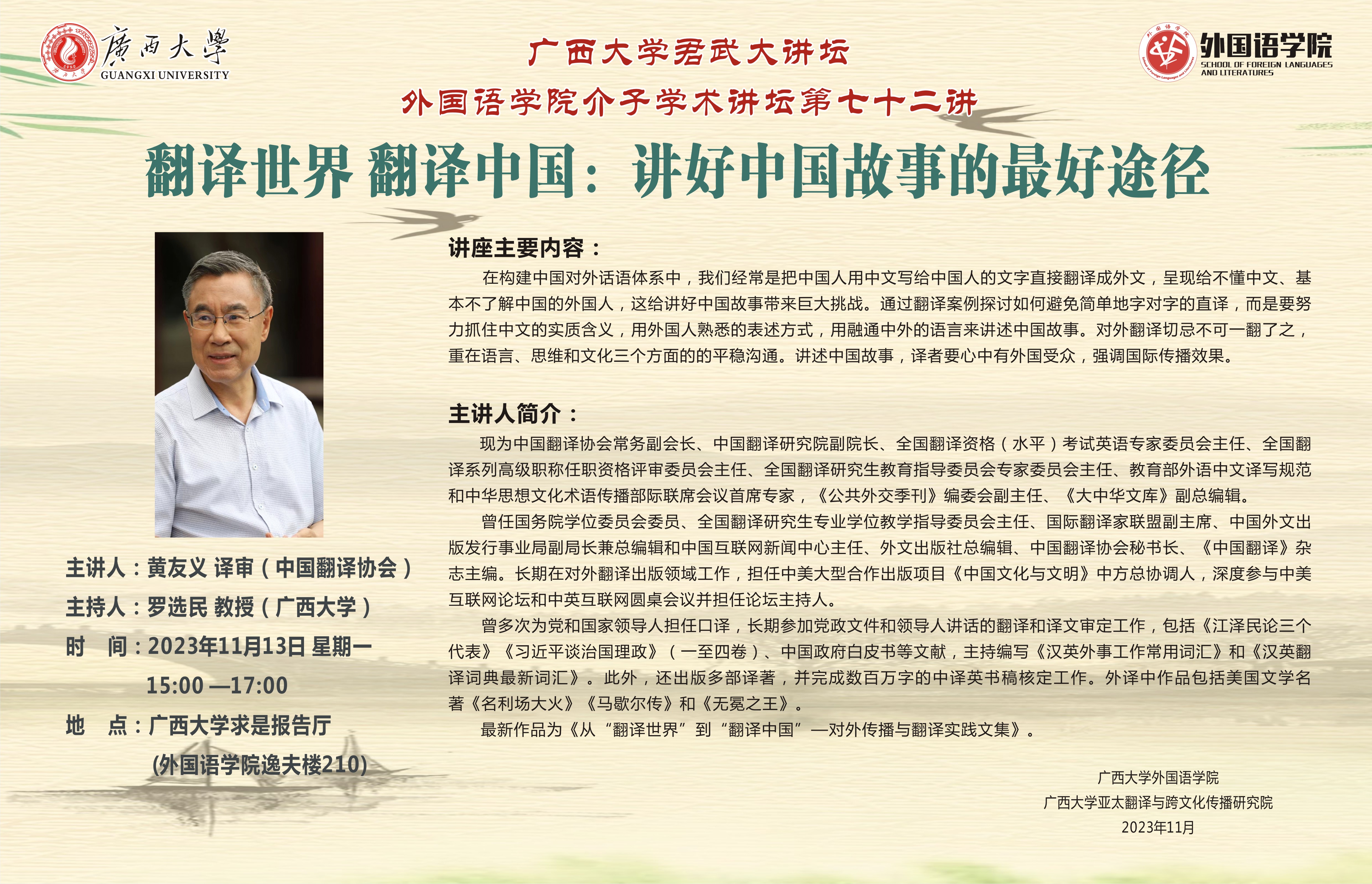 米乐电竞(中国)股份有限公司官网,君武大讲坛/外国语学院介子学术讲坛第七十二讲:翻译世界 翻译中国——讲好中国故事的最好途径