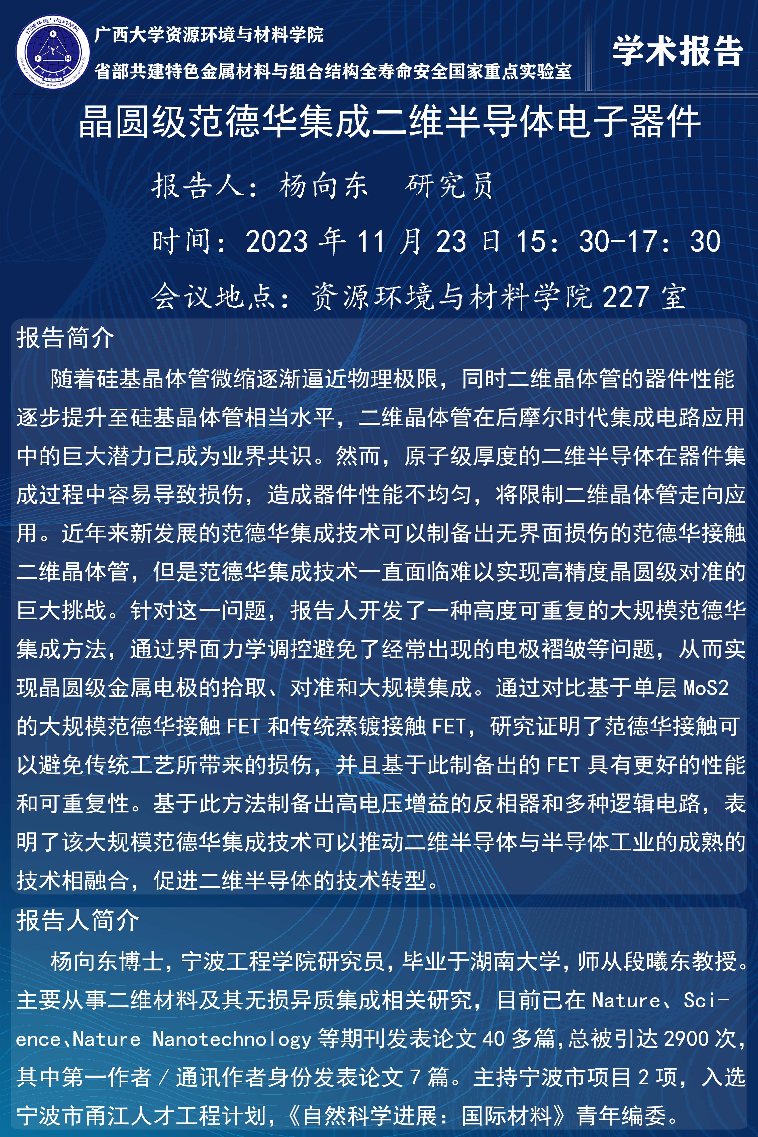 资源环境与材料学院学术报告:晶圆级范德华集成二维半导体电子器件