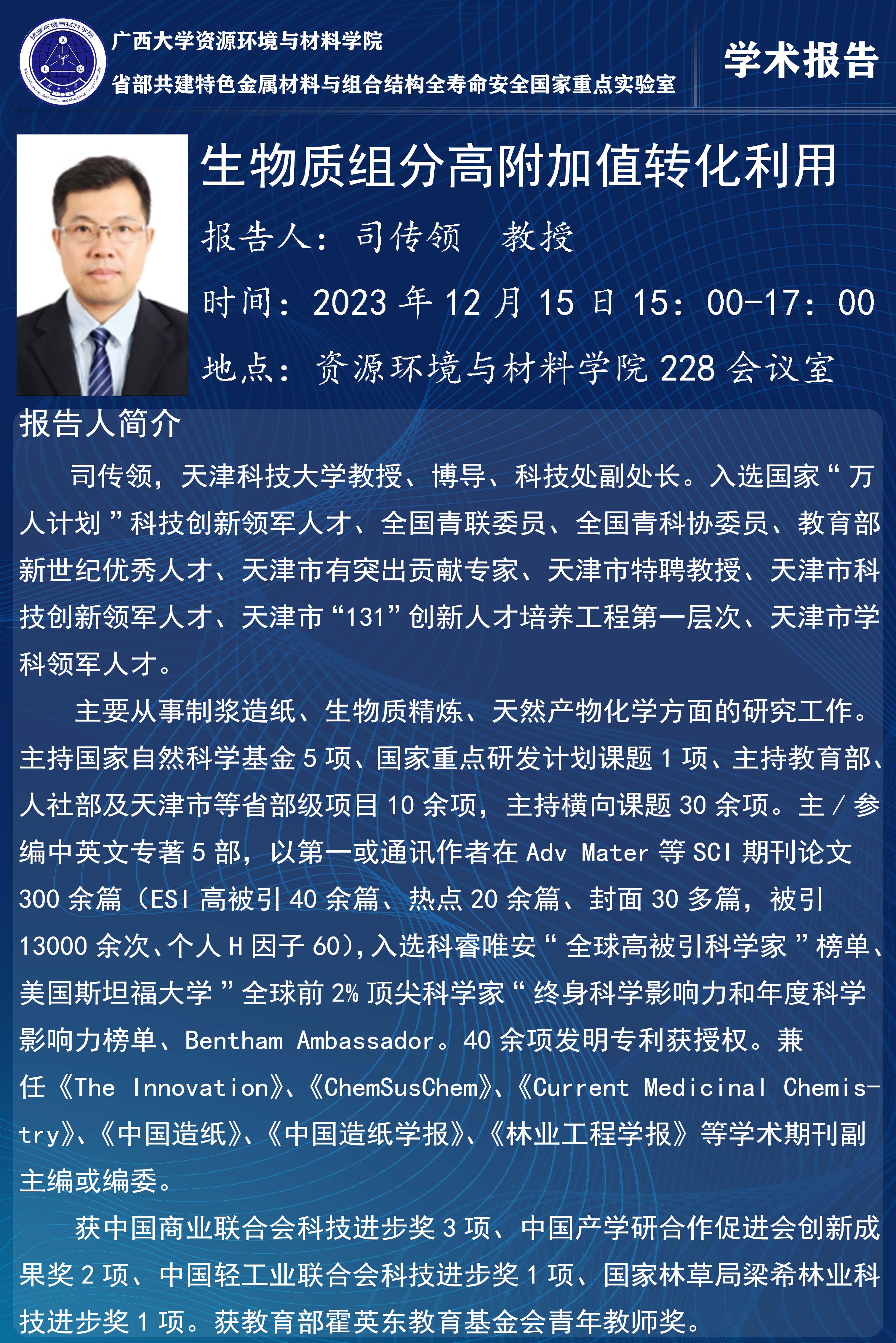 资源环境与材料学院学术报告:生物质组分高附加值转化利用