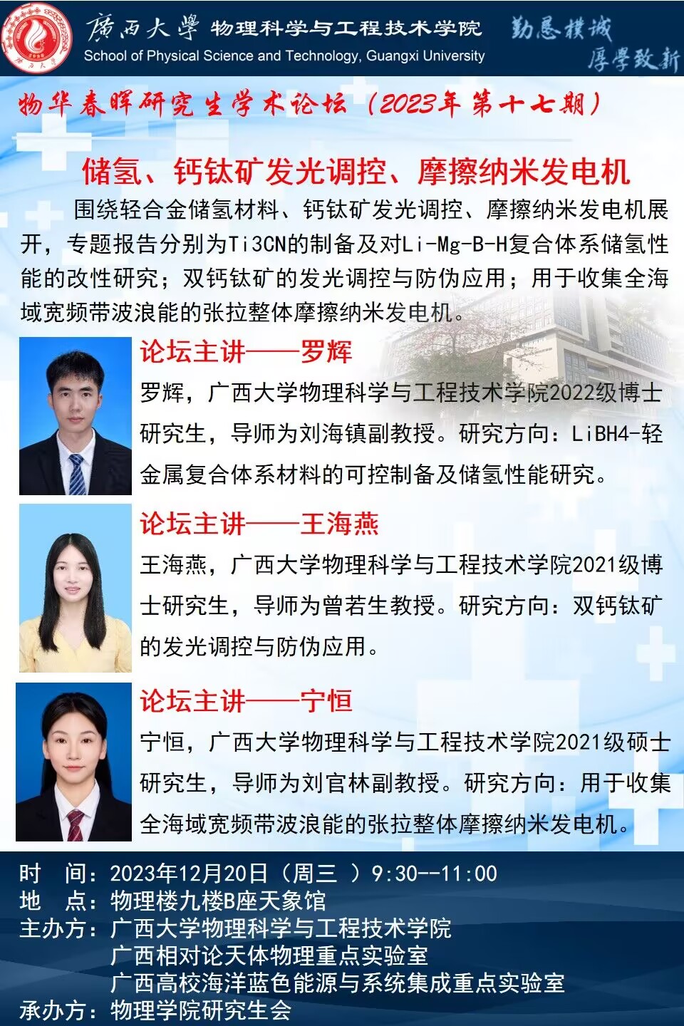 物理学院2023年物华春晖学术论坛(第十七期):储氢、钙钛矿发光调控、摩擦纳米发电机