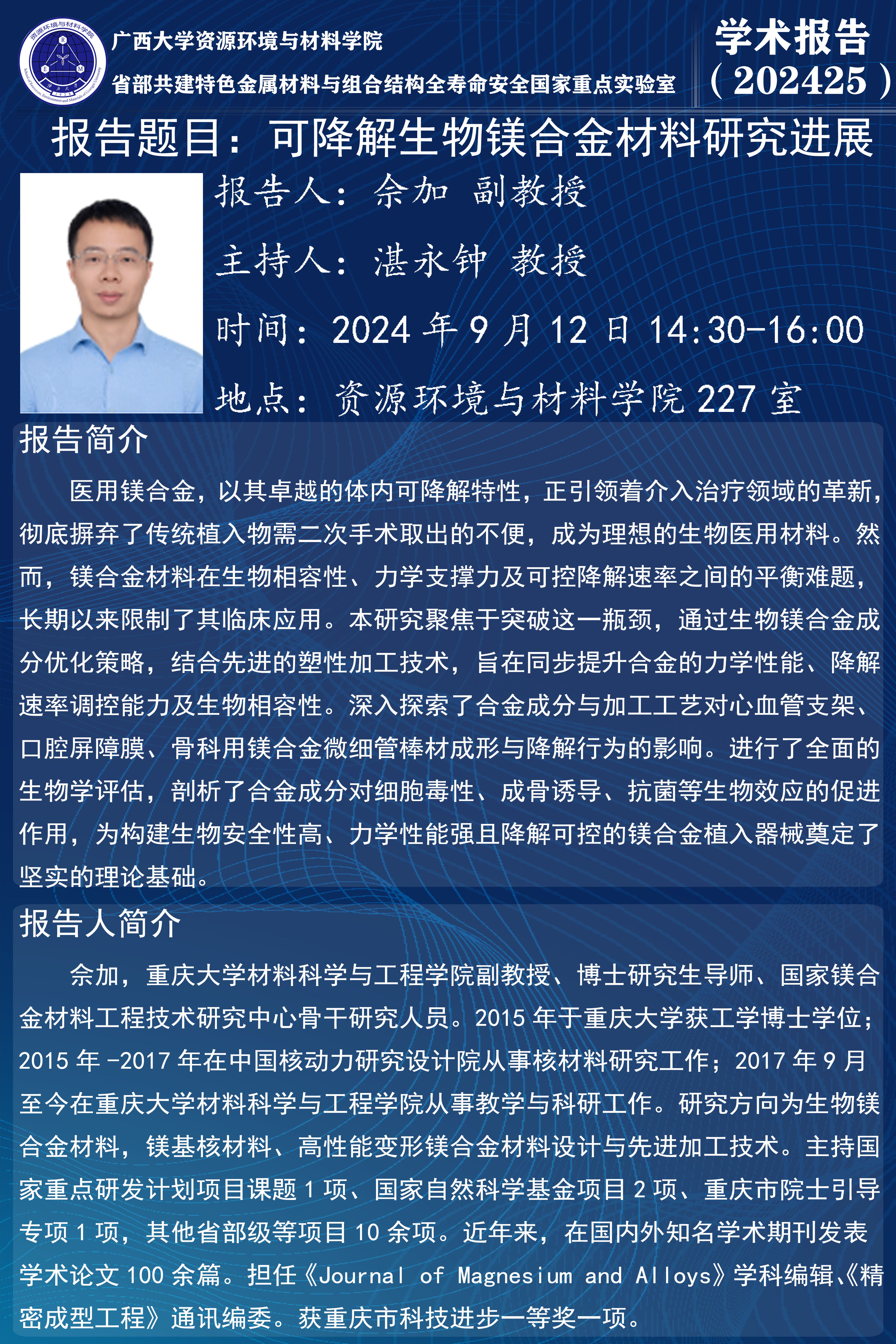 资源环境与材料学院学术报告:可降解生物镁合金材料研究进展