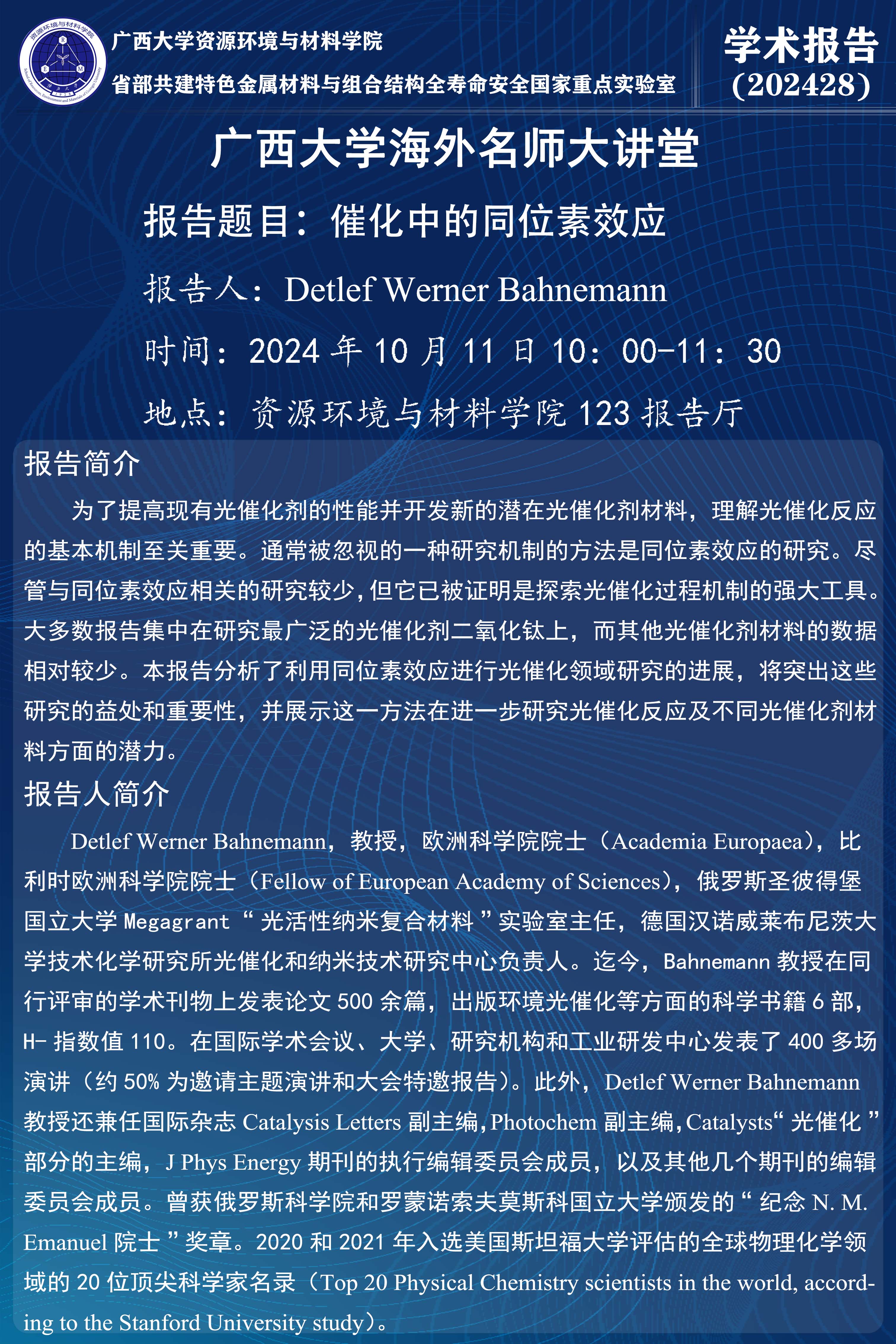 米乐电竞(中国)股份有限公司官网,海外名师大讲堂、资源环境与材料学院学术报告:催化中的同位素效应