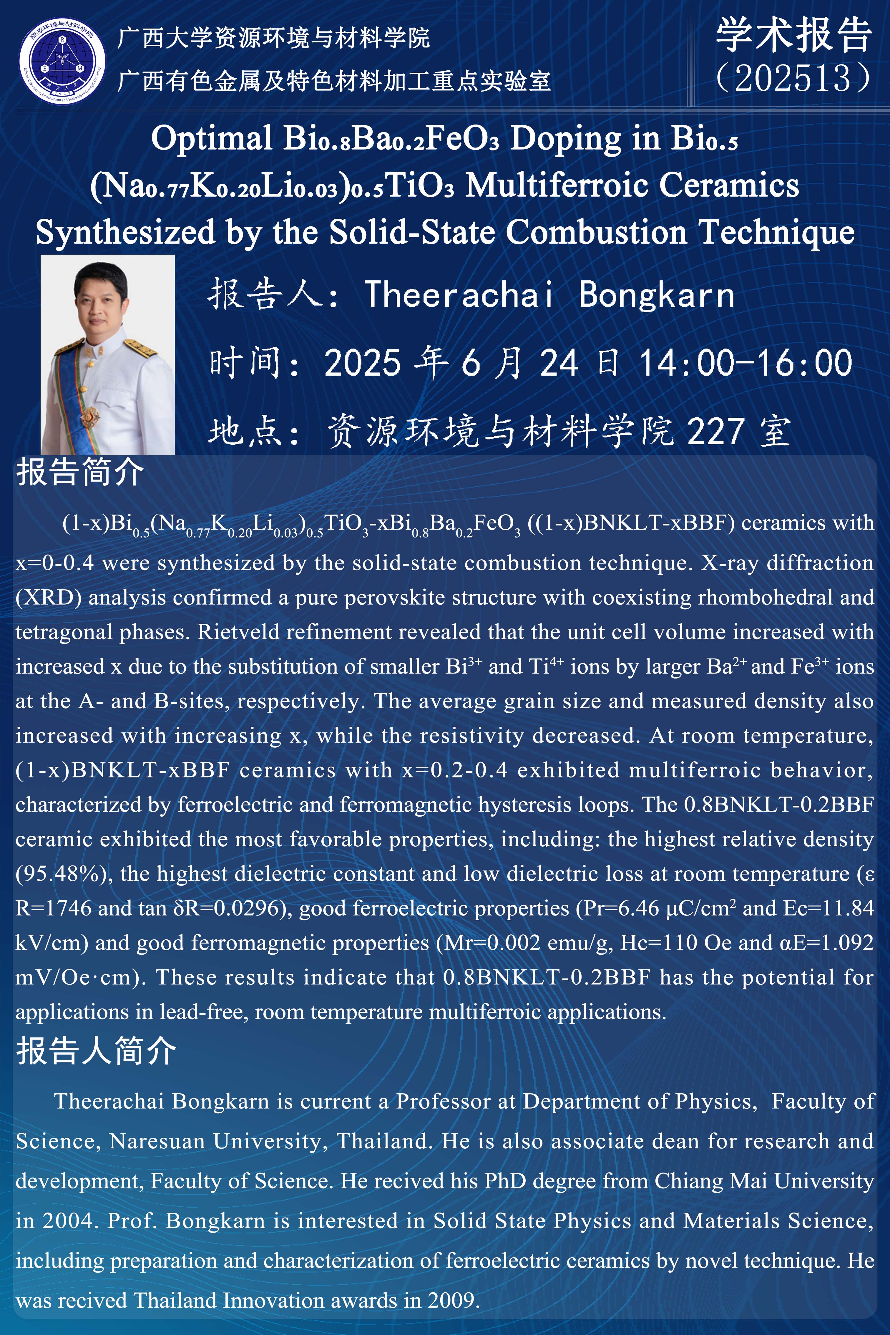 资源环境与材料学院学术报告:Optimal Bi₀.₈Ba₀.₂FeO₃ Doping in Bi₀.₅(Na₀.₇₇K₀.₂₀Li₀.₀₃)₀.₅TiO₃ Multiferroic Ceramics Synthesized by the Solid-State Combustion Technique