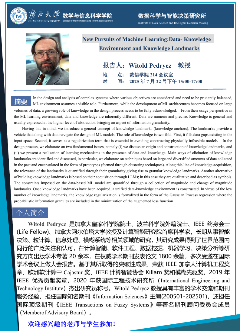 主讲人 Witold Pedrycz 教授 (加拿大阿尔伯塔大学) 地址 数信学院214会议室