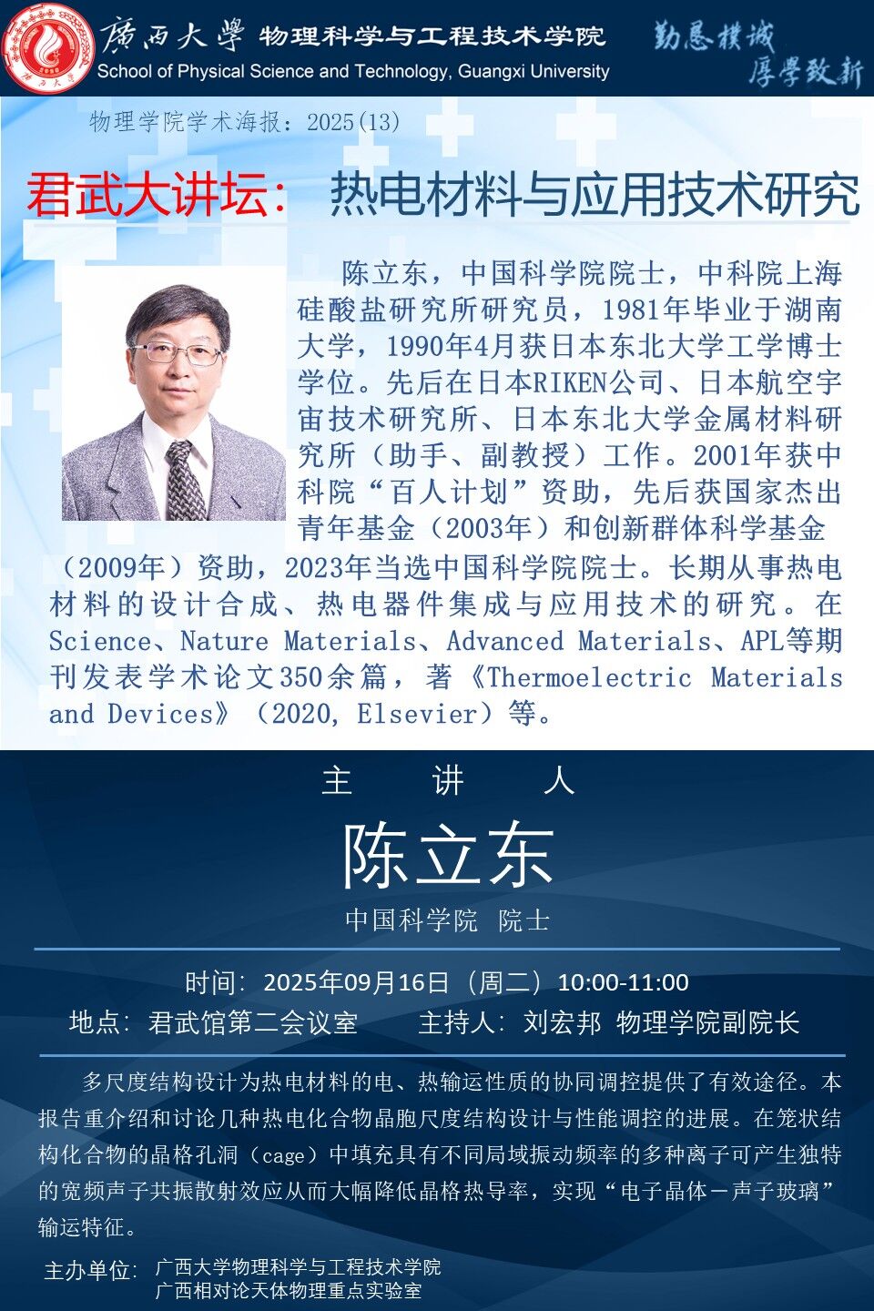 君武大讲坛、物理科学与工程技术学院:热电材料与应用技术研究