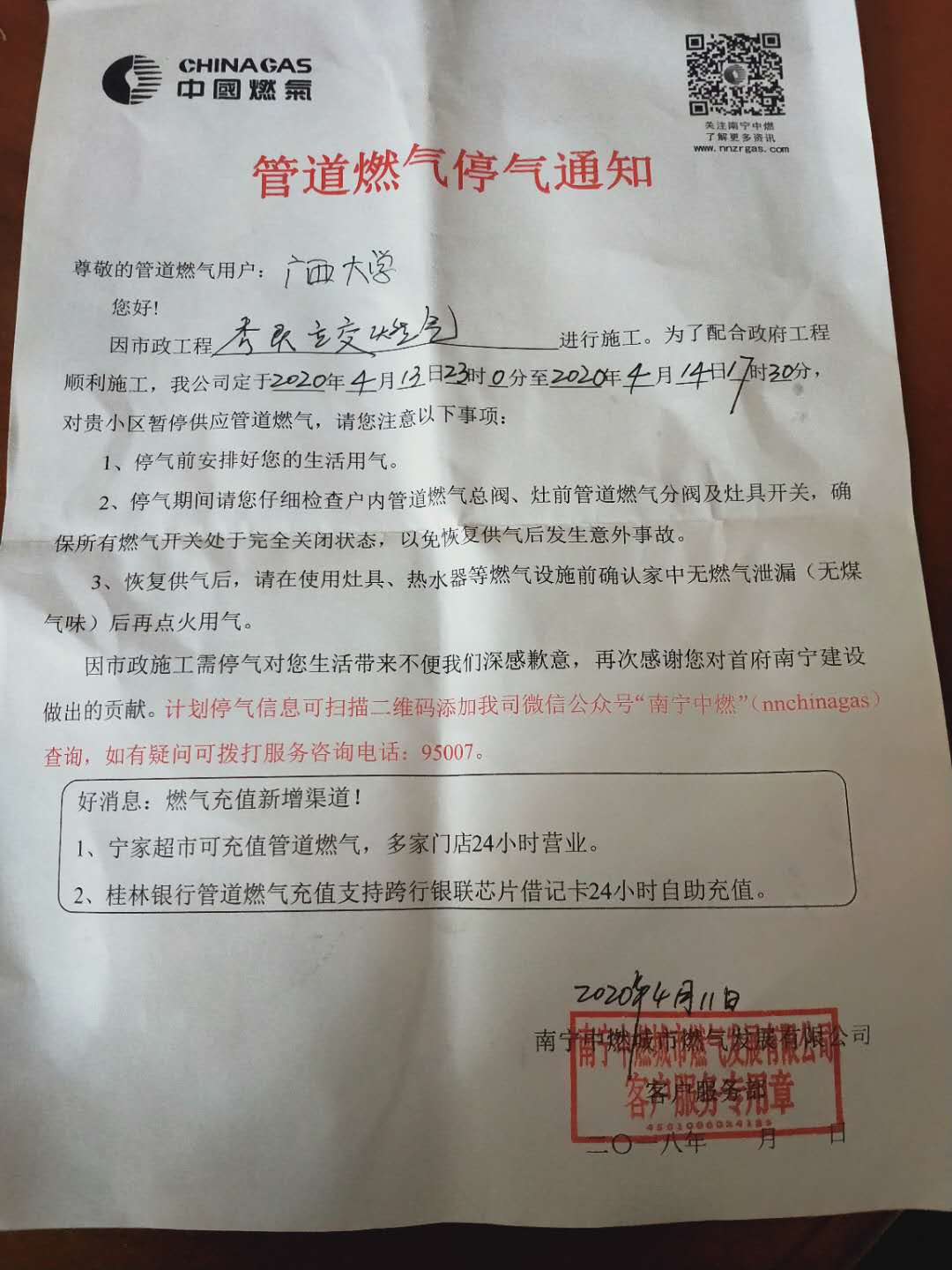 根据南宁中燃城市燃气发展有限公司客户服务部的通知,我校的管道燃气将于2020年4月13日23时0分至4月14日17时30分暂停供应,详见附件。请各住户做好停气准备。不便之处,敬请谅解。