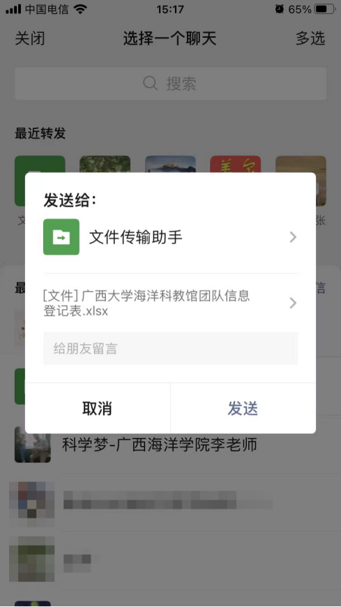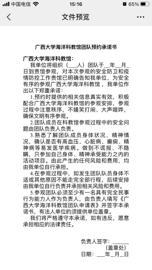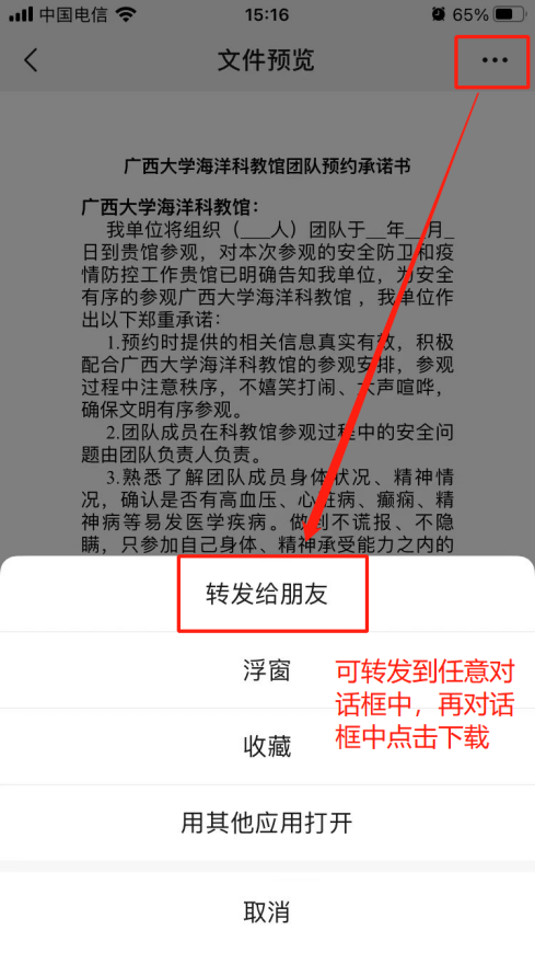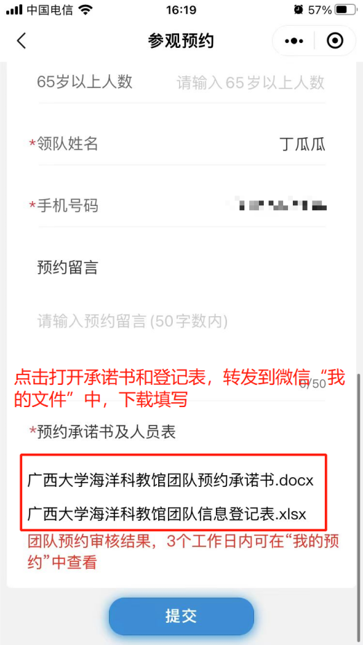5. 预约申请提交后,可先准备团队预约承诺书和人员登记表,点击“米乐电竞(中国)股份有限公司官网,海洋科教馆团队预约承诺书”或“米乐电竞(中国)股份有限公司官网,海洋科教馆团队信息登记表”,转发至微信对话框中(推荐“文件传输助手”),下载后按要求填写预约承诺书和人员登记表内容,填写完成后发送给馆内工作人员,由工作人员审核。