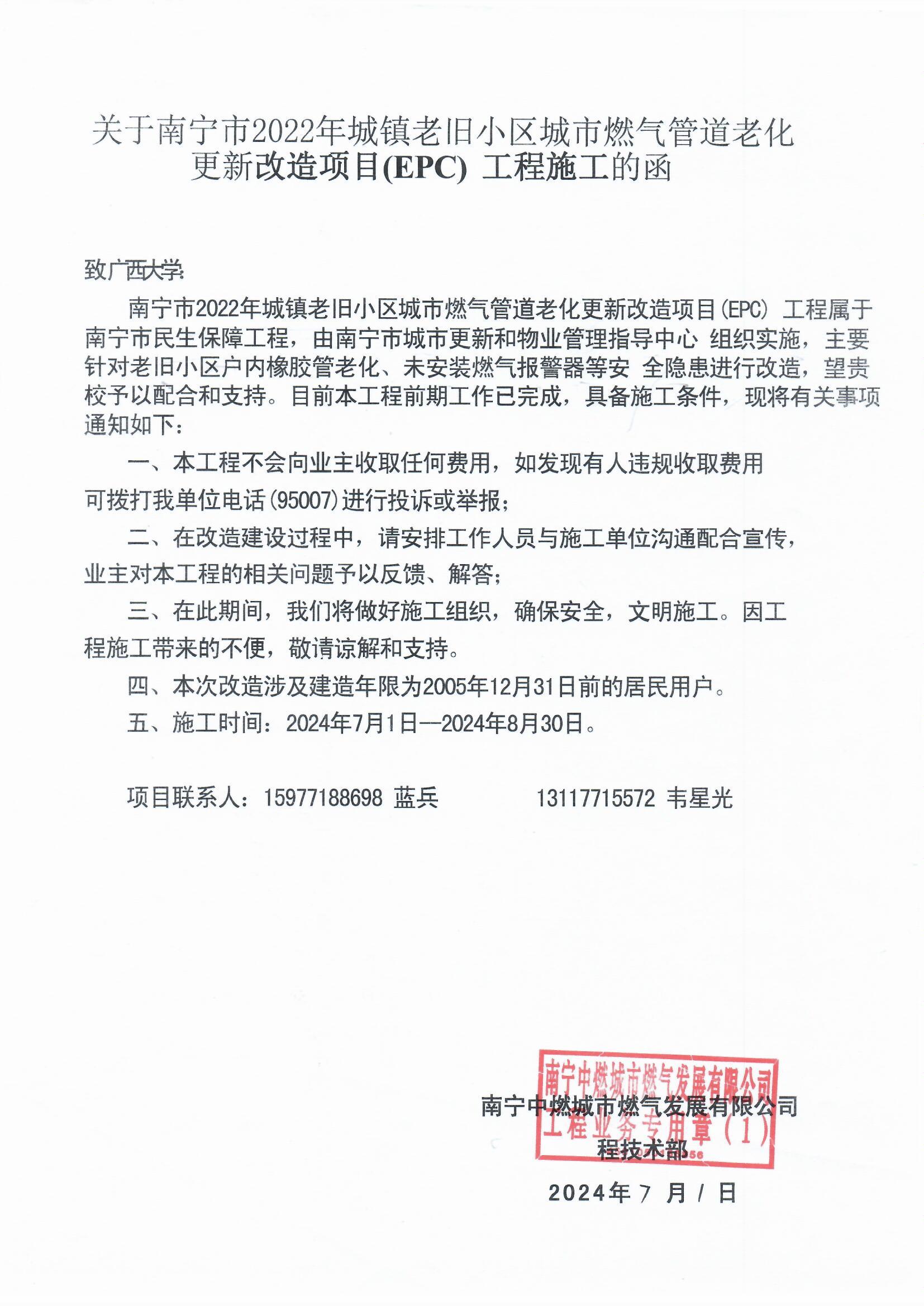根据南宁市中燃城市燃气发展有限公司(以下简称中燃公司)《关于南宁市2022年城镇老旧小区城市燃气管道老化更新改造项目(EPC)工程施工的函》(详见附件),中燃公司将于2024年7月7日—8月30日对我校使用燃气管道住户进行户内橡胶管老化、未安装燃气报警器等安全隐患改造。本次改造涉及建造年限为2005年12月31日前的楼栋居民用户。