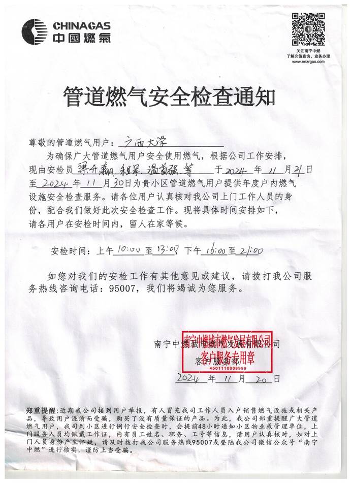 为保障校内燃气用户的用气安全,后勤基建处联系南宁中燃城市燃气发展有限公司开展本年度第二次管道燃气入户安全检查,请各住户于2024年11月21日至11月30日期间做好相关配合工作,现将具体通知如下: