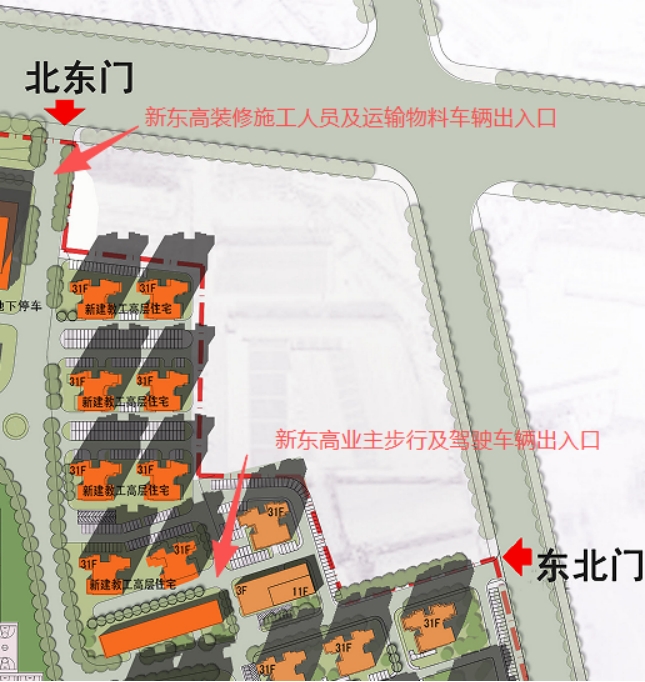 三、新东高在南面增设临时行人与机动车出入口。校内人员及车辆凭证出入(入口领取临时通行卡,出口归还)。业主车辆需停至地下停车场。